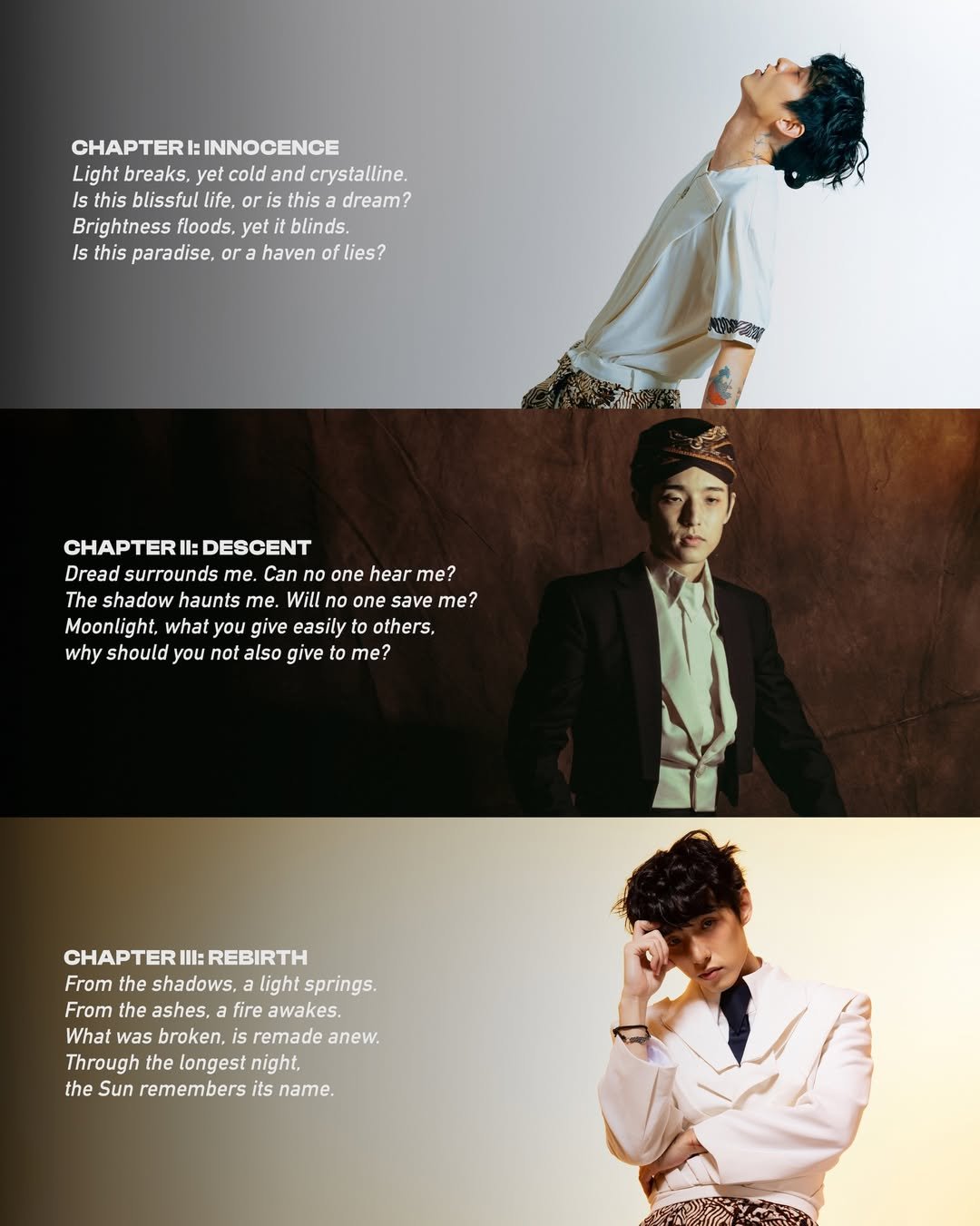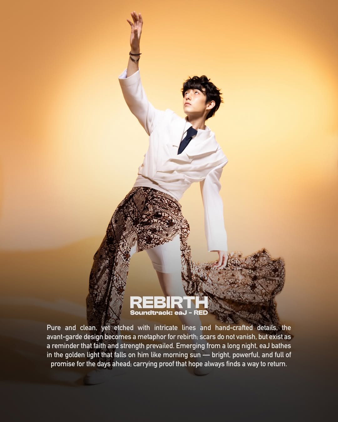 Murni dan bersih, namun terukir dengan garis-garis rumit dan detail buatan tangan, desain avant-garde ini menjadi metafora untuk kelahiran kembali: bekas luka tidak hilang, tetapi ada sebagai pengingat bahwa keyakinan dan kekuatan telah menang. Muncul daei malam panjang, eaJ bermandikan cahaya keemasan yang jatuh padanya seperti matahari pagi- terang, kuat, dan penuh janji untuk hari-hari kedepan membawa bukti bahwa harapan selalu menemukan jalan untuk kembali. Dalam REBIRTH, pakaian eaJ masih menggunakan elemen kain bermotif tradisional yang sama seperti sarung atau kain lilitan seperti pada “INNOCENT” tetapi dipadupadankan dengan kemeja avant’-garde menunjukan bahwa akarnya tetap ada, tetapi kini ia telah bertransformasi menjadi sesuatu yang lebih kuat dan berani. Bekas luka tidak hilang tapi memberikan kekuatan.