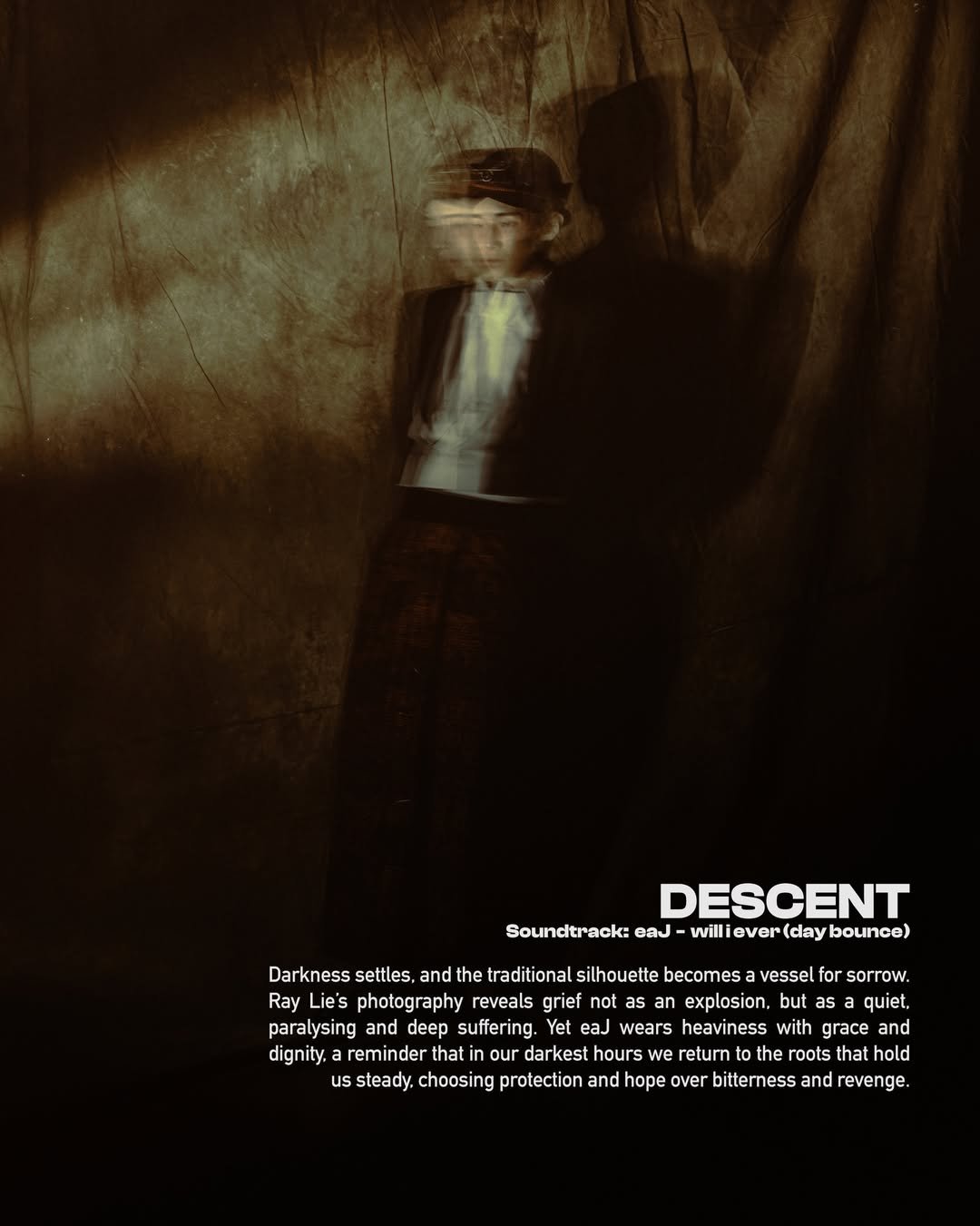 Kegelapan menyelimuti, dan siluet tradisional menjadi wadah bagi kesedihan. Fotografi dari Ray Lie mengungkap kesedihan bukan sebagai ledakan, melainkan sebagai penderitaan yang tenang, melumpuhkan dan mendalam. Namun, eaJ mengenakan beban berat dengan anggun dan bermartabat, sebuah pengingat bahwa di saat-saaat tergelap kita, kita kembali ke akar yang menopang kita, memilih perlindungan dan harapan di atas kepahitan dan balas dendam.
