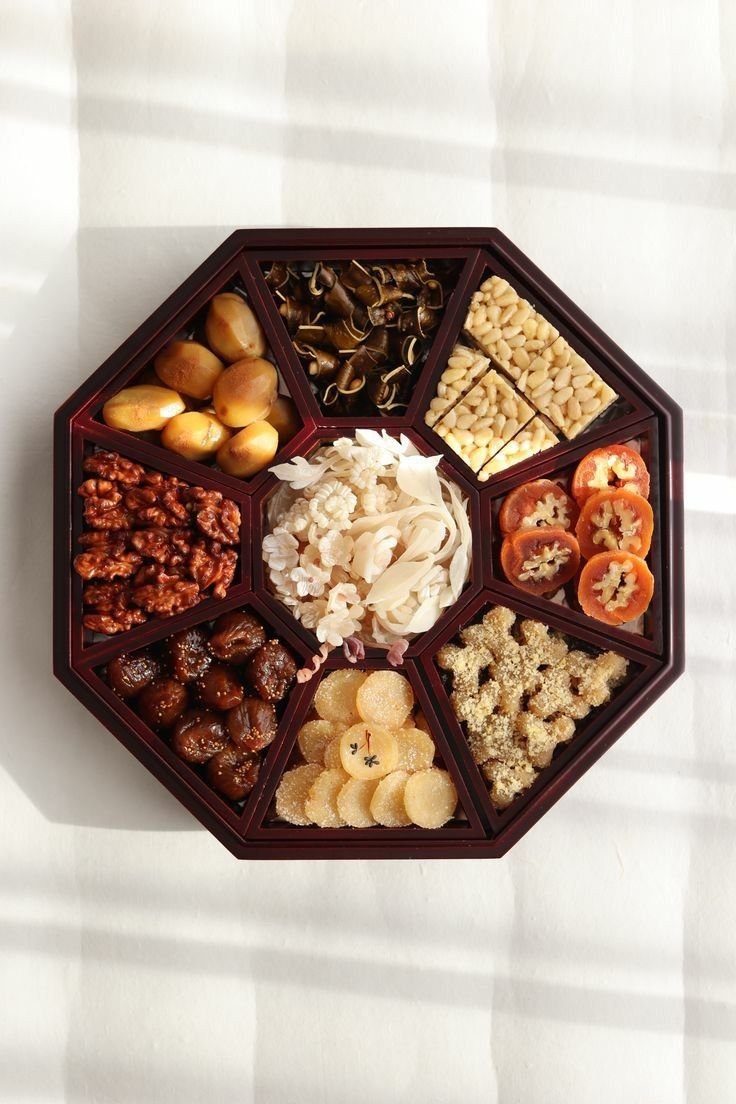 Bingkisan hampers selanjutnya adalah manisan segi delapan atau tray of togetherness. Nama segi delapan ini diambil dari bentuk wadahnya yang punya delapan wadah. Masing-masing wadah akan diisi dengan manisan atau kue kering yang berbeda-beda, seperti manisan melon, jeruk kumquat, kelapa, kelengkeng, biji teratai, leci, kacang tanah, dan semangka. Masing-masing isian mewakili makna yang baik dan tentunya untuk kebersamaan.