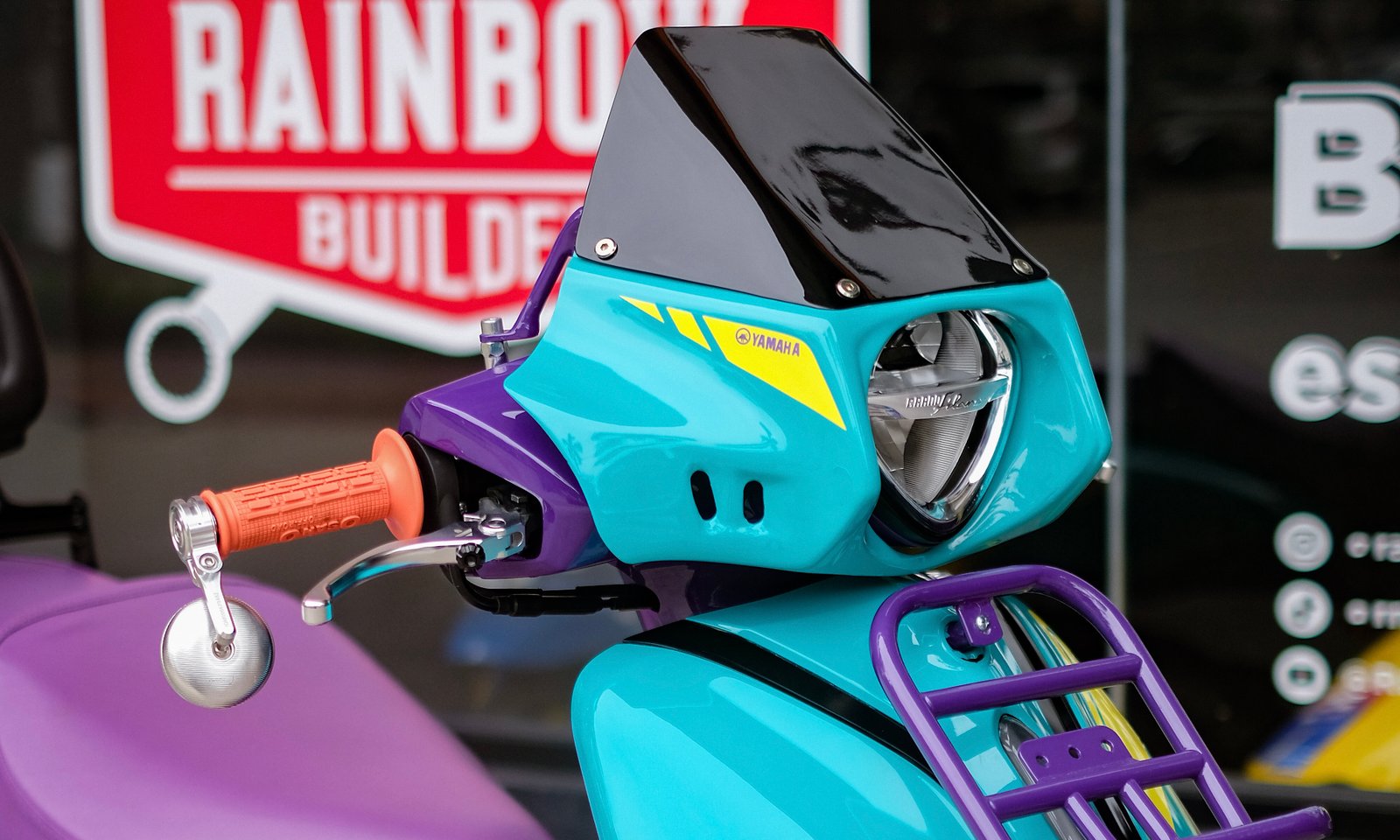 Bagian depan skutik ini tampil berbeda berkat penggunaan custom retro headcover bergaya rally 80-an dengan bentuk lebih tegas dan dilengkapi mini visor smoke. Perpaduan warna tosca dan ungu pada area batok lampu memperkuat karakter Urban Rally yang bold, sekaligus tetap menyatu dengan desain retro modern Grand Filano Hybrid dengan keberadaan front rack berwarna ungu yang terpasang dengan rapih.